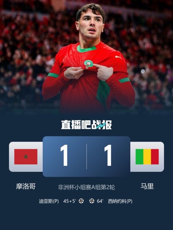 非洲杯-摩洛哥1-1马里下轮打平就出线 迪亚斯点射+连续2场进球