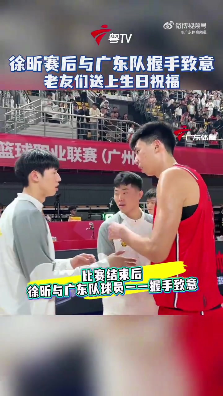 赛后徐昕与广东队队员一一握手致意 前队友们送上生日祝福