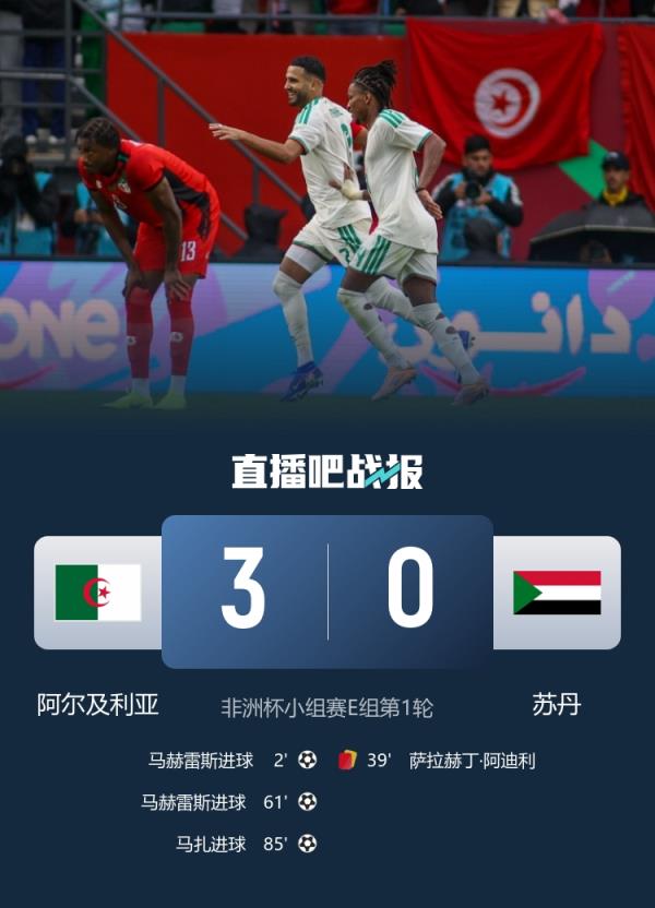 非洲杯小组赛E组第1轮,阿尔及利亚3-0战胜苏丹,马赫雷斯梅开二度。